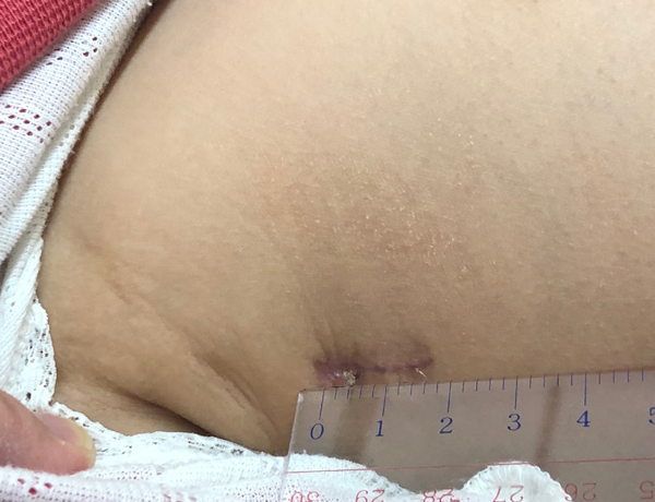 A seven-year-old female patient, diagnosed with ASD, was referred to our hospital. In the prior hospital, she underwent an esophageal echocardiogram to determine the possibility of catheter device closure. She was found to have an ASD with deficient inferior and posterior rims, deemed unsuitable for catheter closure. Therefore, she was referred to us for surgical closure. At our hospital, she underwent cardiac catheterization, which revealed a pulmonary-to-systemic blood flow ratio of 2.7, mean pulmonary arterial pressure of 18 mmHg, and pulmonary vascular resistance of 0.82 unit·m2. The ASD was 23 mm at its largest diameter, and the inferior rim was absent. The patient’s height and weight were 122.0 cm and 26.0 kg, respectively. During the operation, the patient was placed in the supine position with her upper body slightly lifted towards the left side. She was intubated using a double-lumen endotracheal tube. A vertical sub-axillary skin incision was made, and the chest was entered through the fourth intercostal space, where a wrap protector was placed. In between the protector and skin, a carbon dioxide delivery tube was placed. A skin incision was made along the inframammary fold to allow insertion of a 6-mm trocar for a 5-mm endoscope (ENDOEYE®, Olympus Corp., Tokyo, Japan). This incision was used for chest tube placement at the end of the operation. Then, a 1.5-cm skin incision was made at the femoral fold, and the external femoral artery and vein were exposed. After administration of heparin sodium, a 12-Fr straight aortic cannula (NextGen®, BioMedicus Inc. Eden Prairie, MN, USA) was inserted through the femoral artery into the external iliac artery. Subsequently, an 18-Fr straight venous cannula (PCKC-V®, Senko Medical Instrument Mfg. Co., Ltd., Tokyo, Japan) was inserted through the femoral vein into the inferior vena cava just below the diaphragm. After these procedures, the pericardium was opened, and a an 18-Fr straight venous cannula (TWN®, Senko Medical Instrument Mfg. Co., Ltd., Tokyo, Japan) was inserted through the right atrial appendage into the superior vena cava. The left atrial vent and aortic root cardioplegic cannulas were serially placed. The aorta was clamped, and the right atrium was opened. The intraoperative picture of the operative field is shown in Fig. 1. The ASD (2.5×1.5 cm) with a deficient inferior rim was closed directly using a 5-0 Prolene suture. After confirming the absence of leakage, the right atrial incision was closed using a 4-0 Prolene suture, and the aortic clamp was removed. After reduction of the cardiopulmonary bypass flow to 50%, all cannulas placed through the thoracotomy incision were removed. The pericardium was closed, leaving a sufficient window at the bottom, where a 15-Fr chest tube was placed. Until this time, all procedures were performed while the right lung collapsed. After resumption of two-lung ventilation, cardiopulmonary bypass was discontinued, and the femoral cannulas were removed. The myocardial ischemic, cardiopulmonary bypass, and operation times were 39, 137, and 250 min, respectively. She was then transferred to the intensive care unit in stable condition. She was weaned off from the ventilator and extubated two hours after the surgery. She was transferred to the general ward on day 2 and discharged on day 8. The intraoperative esophageal and immediate postoperative echocardiograms revealed an absence of an ASD leak. The length of skin incision was 1.5 cm (Fig. 2).