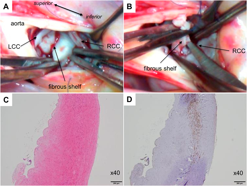 Re-sternotomy was performed and cardiopulmonary bypass was initiated using the ascending aortic and bicaval cannulation with left atrial venting. After the aortic cross-clamp was applied, the subaortic area was visualized through a transaortic approach. Closely related to three almost normal aortic valve cusps, a white thickening resembling two fused half-disk shapes was observed to form a fibrous shelf, extending from the center of the left coronary cusp to the right coronary cusps (Fig. 2A; Supplementary Video S1). This “bi-valved” shelf was carefully resected to avoid cusp injury (Fig. 2B).