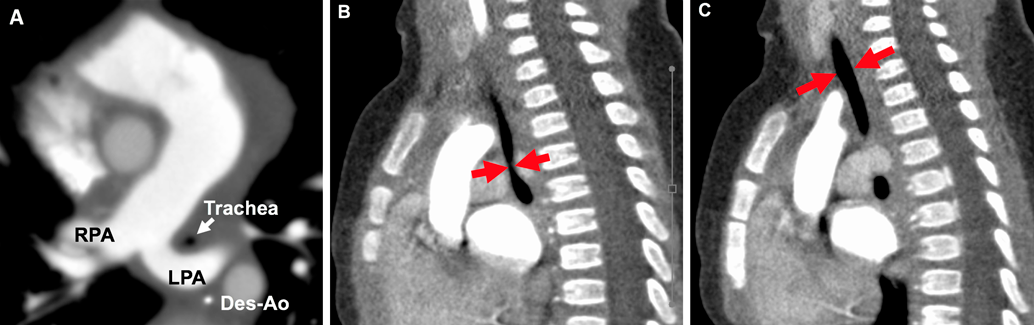 Our initial concern was whether tracheal stenosis would improve by PA sling repair only. Fortunately, a retrospective review of our series demonstrated that all patients showed significant tracheal growth soon after the repair. However, it is difficult to define absolute tracheal surgical indication based on either tracheal size or severity of symptoms.