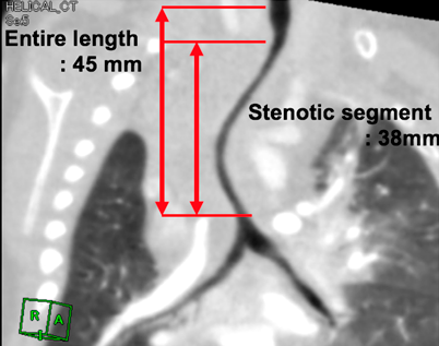 We evaluated the details of tracheal stenosis using CT (Fig. 1A) and calculated the stenotic segment ratio, which was estimated by the following formula (Fig. 1B, 1C)4):We also calculated the longitudinal stenotic tracheal segment ratio as shown in Fig. 2. Long-segment tracheal stenosis was defined as the ratio of the stenotic tracheal segment to that of the entire tracheal length of >50%.5)