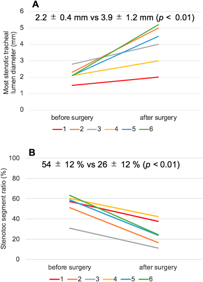 Postoperative tracheal lesions were assessed using contrast CT in all patients. The preoperative median stenotic segment ratio and longitudinal stenotic tracheal segment ratio were 54% and 78%, respectively. In five of six patients, the longitudinal stenotic tracheal segment ratio was >50%. All patients showed significant growth in the tracheal lumen diameter (Fig. 3A). The mean lumen diameter of the most stenotic part of the trachea increased from 2.2 mm before to 3.9 mm after PA sling repair (p<0.01, paired t test). Additionally, the stenotic segment ratio improved from 54% before to 26% after PA sling repair (p<0.01, paired t test) (Fig. 3B).