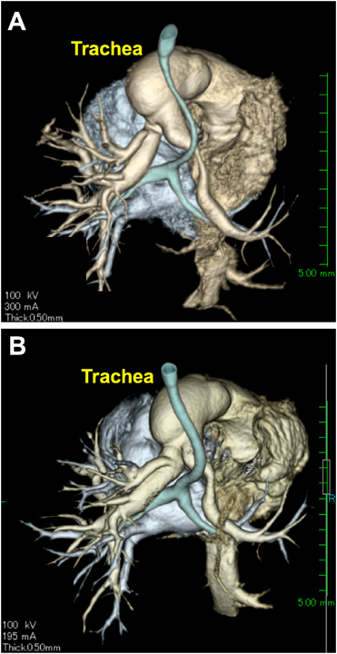 Fig. 4 showed the postoperative three-dimensional contrast CT in patient No. 5 at 2 weeks (A) and 1 year (B) after the surgery. The patient No. 5 had a very long longitudinal stenotic tracheal segment ratio of 84%, however, the longitudinal stenosis was clearly improved at 1 year after the surgery. All 5 surviving patients have not experienced any major respiratory problems, fortunately. Also, no patients have experienced any tracheal intervention after the PA sling repair.