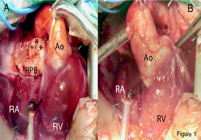 A 7-day-old male newborn weighing 3.5 kg, referred for cyanosis. Echocardiography revealed a double inlet left ventricle and pulmonary atresia, left aortic arch, left descending aorta, and a tortuous, left patent ductus arteriosus of 4 mm in diameter. To perform an emergency right modified Blalock–Taussig shunt, a median sternotomy was used. On dissecting the superior border of the right pulmonary artery a vessel of approximately 4 mm in diameter was encountered (Fig. 1A). Diagnoses of the left pulmonary artery sling or isolated subclavian artery were ruled out. The vessel was traced between the trachea and the esophagus to the isthmic portion of the thoracic aorta, confirming the ductus arteriosus sling (Fig. 1B). We have dissected the pulmonary branch confluence and the atretic pulmonary trunk behind the aorta and confirmed the anomalous vessel was not inserting into the left pulmonary artery, but into the right. Normothermic cardiopulmonary bypass was used, ductus arteriosus was divided and a modified Blalock-Taussig shunt was performed with a 3.5 mm polytetrafluoroethylene tube. The postoperative course was without complications.