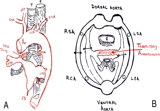 Ao, aorta; E, esophagus; LCA, left common artery; LPB, left pulmonary branch; LSA, left subclavian artery; PA, pulmonary atresia; RCA, right common artery; RPB, right pulmonary branch; RSA, right subclavian artery; T, trachea.