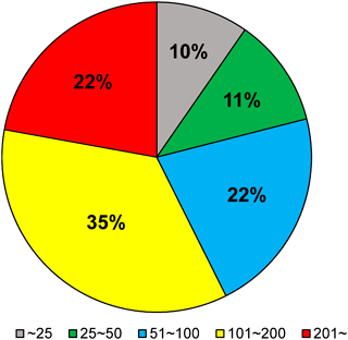 | 1. Less than 50 cases 2. 50 to 100 cases 3. 100 to 300 cases 4. 300 to 500 cases 5. 500 cases or more |