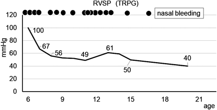 Despite of insufficient therapies for PAH in the outpatient clinic, he showed few symptoms and his RVSP measured from the tricuspid regurgitation flow velocity on echocardiogram showed a decrease(Fig. 1). Later in junior high school, he had no difficulty in physical activity and participated in all the school activities including exercise. At the age of 13, RVSP on echocardiogram was high at 61 mmHg and we started him on beraprost, but again, he could not take it regularly due to the minor adverse effects. At the age of 14, we discontinued bunazosin and beraprost since he was irregular with taking the medications. At the age of 20 years, his RVSP on echocardiogram decreased to 40 mmHg; subsequently we could not evaluate his RVSP because his tricuspid regurgitation flow became too small to measure. He discontinued follow-up because he felt no symptom and no difficulty in his daily university life.