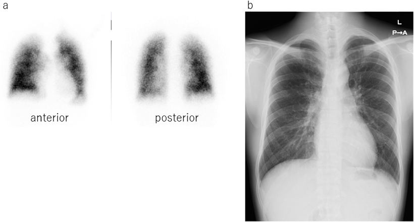 At the age of 28 years, he visited our outpatient clinic again because he recognized the severity and the poor prognosis of PAH through his university curriculum. He had no symptoms in his daily work and could easily go upstairs to 5 floors at his office. He could walk over 660 m in 6MWT and SpO2 were slightly decreased from 98% to 93% after 6MWT. His serum brain natriuretic protein was as low as below normal level. Echocardiogram revealed his right ventricle was not dilated and had preserved contraction. Chest X-ray showed mild dilatation on pulmonary trunk and lung perfusion scintigraphy showed mild diffuse patchy pattern which was typical in PAH(Fig. 2). Chest plain computed tomography could not detect abnormality. Treadmill cardiopulmonary functional test revealed SpO2 depletion from 98% to 92%.