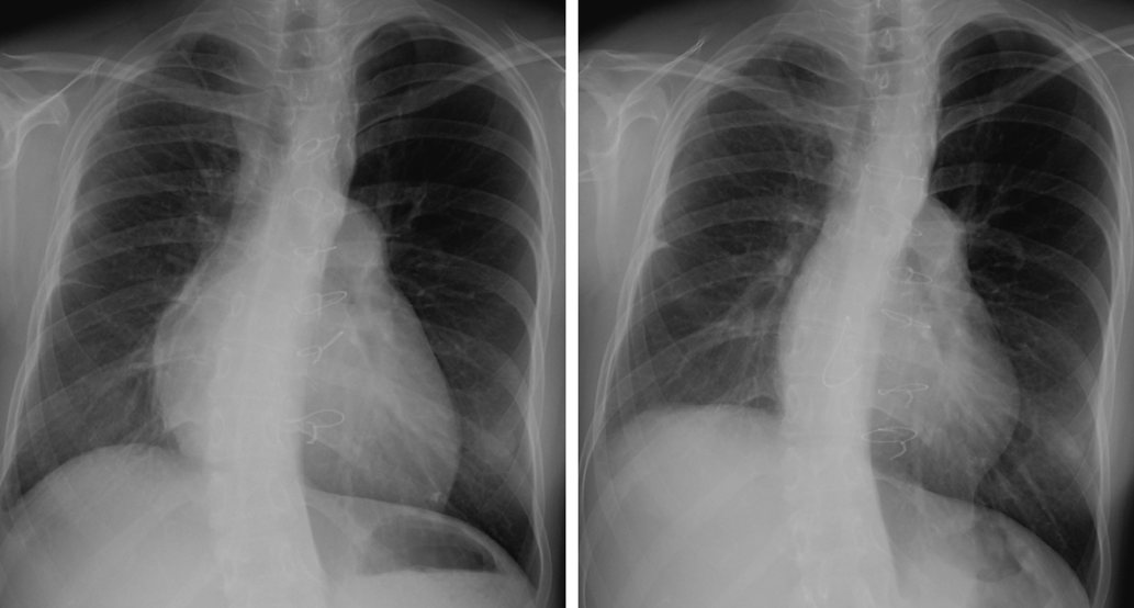 Her clinical record presented the first surgical treatment of ALCAPA using Takeuchi repair when she was one-month-old. She then underwent the following reoperations at the previous hospital: (1) residual coronary shunt closure in the reconstructed root with mitral repair when she was 1 year old; (2) the right pulmonary arterial plasty when she was 2; and (3) residual coronary shunt closure with the right ventricular outflow tract (RVOT) reconstruction using a tissue engineering patch when she was 14. However, a large patch without a leaflet caused severe pulmonary regurgitation (PR) with enlarged RV, resulting in severe tricuspid regurgitation (TR) caused by tricuspid annular dilatation. Six months before the pregnancy, she took another operation in our hospital when she was 29 year old. An expanded polytetrafluoroethylene (ePTFE) valved conduit, 22 mm of internal dimension, was used for PR repair and the Contuor 3D annuloplasty ring (Medtronic, Minneapolis, MN, USA) was applied for TR repair. The overall outcome of the RVOT reconstruction and the tricuspid valve plasty was excellent. The cardiothoracic ratio on chest X-ray was 59% and 50% before and 3 months after the operation, respectively (Fig. 1). Analogously, RV end-diastolic volume index by cardiac magnetic resonance (CMR) imaging improved from 189 mL/m2 to 64.2 mL/m2, and RV end-systolic volume index from 78.3 mL/m2 to 24.6 mL/m2. PR fraction improved from 43.4% to 4.5% (movie 1, 2). Cardiac output index increased from 1.7 L/min/m2 to 3.51 L/min/m2 calculated in CMR through the operation.