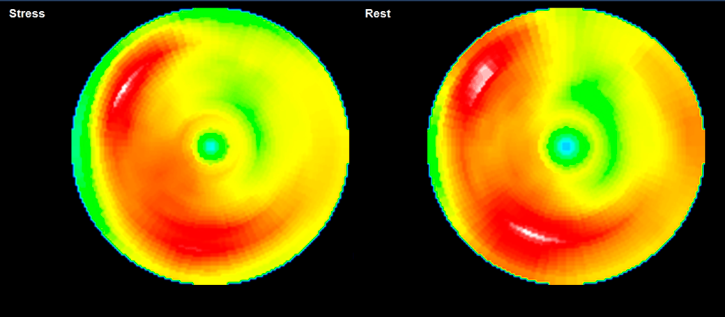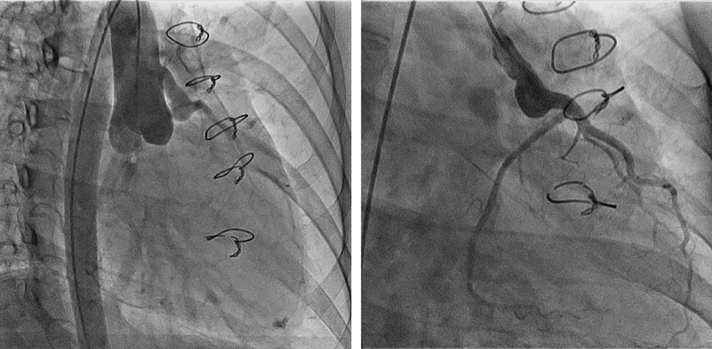 The postoperative medications including warfarin for 3 months and aspirin for 6 months as anticoagulant and antiplatelet therapies after the valve replacement were completed when she got pregnant. While, the preoperative examinations indicated good LV performance and sufficient myocardial blood supply to the coronary arteries. A myocardial perfusion scintigraphy using Technetium-99 m-labeled tetrofosmin did not indicate any significant ischemic changes both at rest and under stress (Fig. 2) with a good LV ejection fraction (LVEF) of 64%. A coronary angiography revealed a smooth blood flow through the Takeuchi route (Fig. 3).