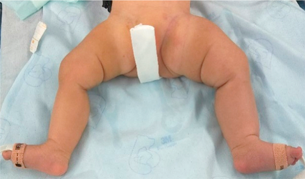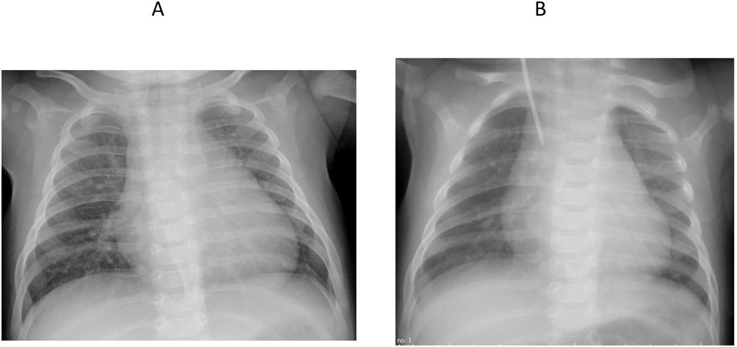 The baby was born at a local obstetrics and gynecology clinic via vaginal delivery at 39 weeks and 6 days of gestation, with an Apgar score of 9/9 and birth weight of 3,046 g. No use of forceps or vacuum on delivery, and there was no trauma on her body. Distressed breathing appeared from postnatal Day 3, and the patient was transferred to the previous neonatal intensive care unit on Day 7. On echocardiography, the right atrium and right ventricle were enlarged, and the inferior vena cava (IVC) was dilated, indicating congestive heart failure. However, congenital heart disease was not detected, and oral diuretic therapy improved her symptoms. She was transferred to our hospital for further investigation and treatment on Day 18.