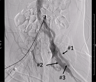 #1: Left superficial femoral artery, #2: Left superficial femoral vein, #3: Arteriovenous fistula.