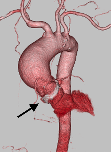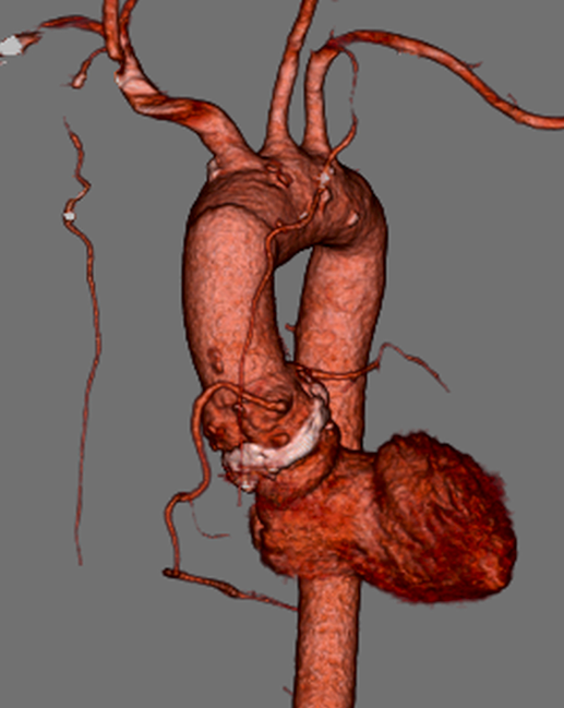 A 45-year-old male scheduled for thyroid tumor resection was referred to our institution for ascending aortic aneurysm, distal autograft aneurysm and right ventricle to pulmonary artery (RV-PA) conduit stenosis. He underwent the Ross procedure with aortic root fixation by Dacron felt 20 years previously for valvular aortic stenosis and regurgitation related with bicuspid aortic valve. No reinforcement material was utilized for the distal suture line, and the right ventricular outflow tract was reconstructed with a 30-mm bicuspid pericardial roll conduit. His postoperative recovery after the Ross procedure was uneventful; however, he was lost for follow-up after a few routine clinic visits. His autograft aneurysm was revealed coincidentally by preoperative chest CT scan for thyroid tumor.