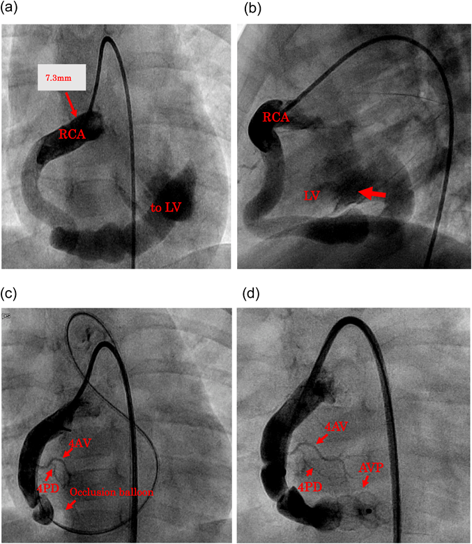 (a) The coronary artery fistula is from the RCA to the LV. The RCA is markedly dilated (7.3 mm). (b) A lateral view shows the course of the fistula from the RCA to the opening in the LV. (c) With the fistula temporarily occluded, the normal course of the RCA was identified. The so-called 4AV and 4PD are clearly visualized. (d) The AVP has just uncovered. Contrast medium was injected repeatedly through the guiding sheath in order to confirm the optimal site of device implantation. AVP, Amplatzer™ Vascular Plug II; 4AV, #4 atrioventricular branch; 4PD, #4 posterior descending branch; LV, left ventricle; RCA, right coronary artery.