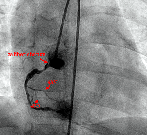 One year and 5 months after the intervention, the patient underwent RCA angiography to evaluate changes in the RCA following CAF closure. The proximal portion of the RCA was patent. There had been a caliber change there, with a vessel diameter of approximately 1.6 mm (Fig. 2). Therefore, antiplatelet agents and anticoagulants were continued.