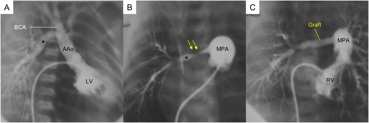 A: Preoperative left ventriculogram.B: Pulmonary arterial angiogram after the initial repair. C: Rght ventriculogram after revision of the right pulmonary artery. AAo, ascending aorta; BCA, bracheocephalic artery; LV, left ventricle; MPA, main pulmonary arterial trunk; RV, right ventricle. Black asterisk: right pulmonary artery; yellow arrows: stenosis.