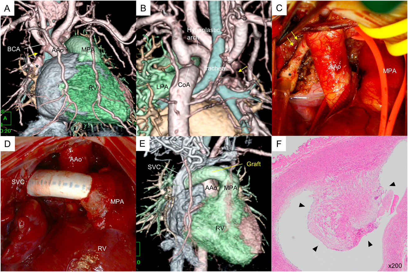 A boy weighing 2.5 kg was transferred to our hospital on the first day of life with desaturation and diagnosed as having distal AORPA, CoA, small PDA, and ventricular septal defect (VSD) on echocardiography. Preoperative computed tomography revealed that the RPA originated from the distal portion of the AAo immediately proximal to the bracheocephalic artery with severe stenosis at its origin (Fig. 2A). Severe CoA was present and the transverse arch was hypoplastic (Fig. 2B). Pulmonary overcirculation started at 1 day old, and progressed gradually. The patient was managed without prostaglandin administration until 5 days old when the small PDA was closed and a minor blood pressure difference (approximately 20 mmHg) was demonstrated between the upper and the lower limbs. Primary surgical repair was performed at 16 days old. After repair of the CoA using an extended aortic arch anastomosis, the proximal RPA including the stenotic tissue (Fig. 2C) was sufficiently resected. The right and the left pulmonary arteries were well mobilized up to the hilar branches; still, tension-free reconstruction by direct anastomosis was not feasible between the distal RPA and the MPA because of their distance. The RPA was eventually reconstructed using a 6-mm expanded polytetrafluoroethylene graft in the way in which the tube was coursing anterior to the AAo and curving upwards to avoid compression from the sternum (Fig. 2D, E). Histological investigations using hematoxylin-eosin staining showed mucopolysaccharides accumulated beneath the elastic layer, which were identified as a PDA tissue (Fig. 2F). On echocardiography, the peak pressure gradient estimated by tricuspid valve regurgitation had decreased from 67 to 28 mmHg. No signs of RPA stenosis were observed 1 year postoperatively.