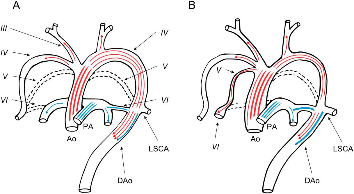 A: Normal. B: In AORPA of the distal form. Ao, aorta; AORPA, anomalous origin of the right pulmonary artery from the ascending aorta; DAo, descending aorta; III, IV, V, VI, aortic arches; LSCA, left subclavian artery; PA, pulmonary artery. Red arrows: blood from the left ventricle; blue arrows: blood from the right ventricle.