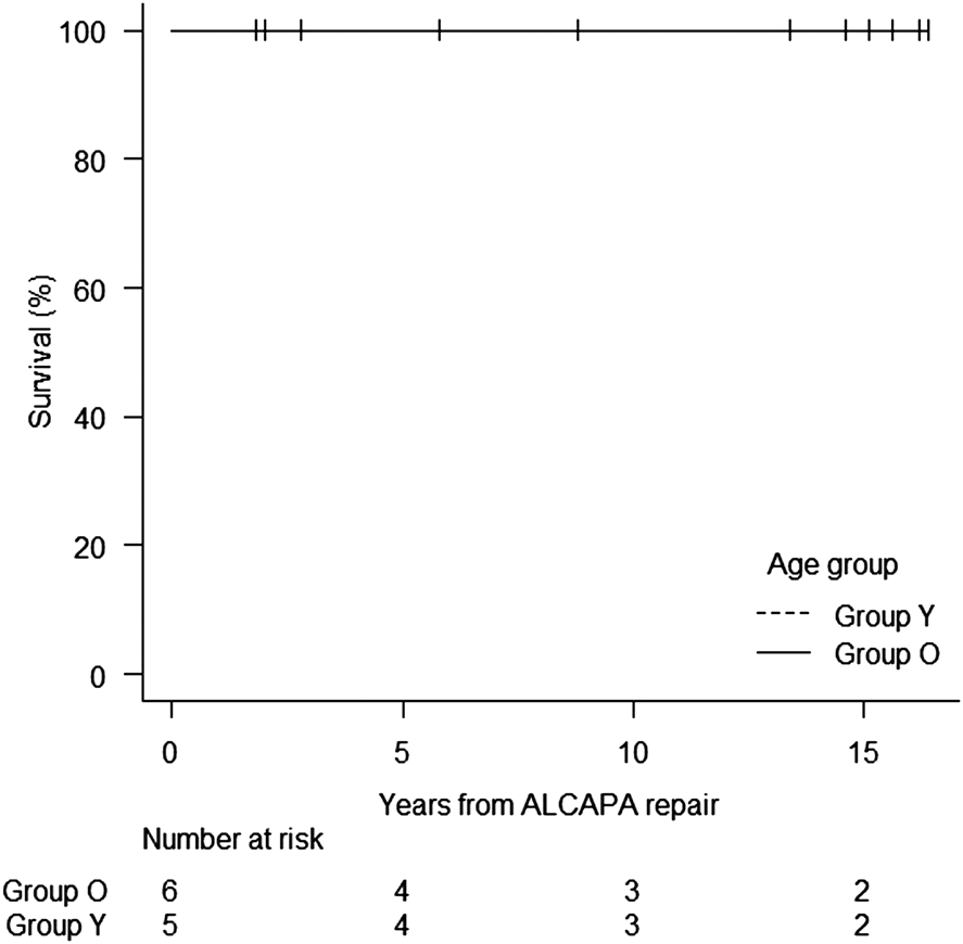 There were no late deaths in the follow-up of 14.6 (range 2.0–16.2) years in group Y and 11.1 (range 1.8–16.4) years in group O (Table 3). Kaplan–Meier survival rate was 100% at 5, 10, and 15 years in both groups (Fig. 1).