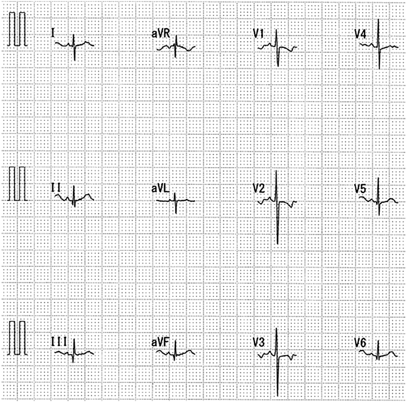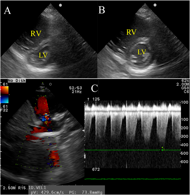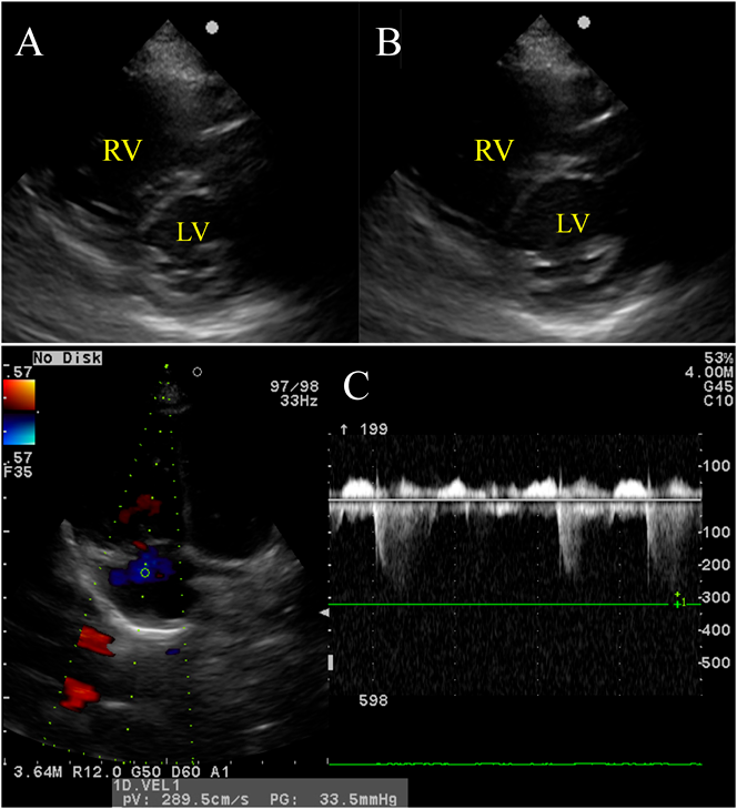 Chest radiography showed no abnormalities in the lung field and no cardiac enlargement. The main pulmonary artery was slightly enlarged (Fig. 1). Electrocardiography (ECG) showed a sinus rhythm with right axis deviation (Fig. 2). Echocardiography revealed enlargement of the right ventricle (RV) and right atrium (RA) and bulging of the interventricular septum to the left ventricle (LV). Tricuspid regurgitation (TR) was moderate, with a peak TR jet velocity of 4.29 m/s (Fig. 3). RV pressure was estimated to be 73 mmHg plus RA pressure; accordingly, severe PAH was suspected. Contrast echocardiography was performed to differentiate diseases causing hypoxemia. Microbubbles were stagnant in the RA and RV, with RV function markedly deteriorated, and did not enter into the left heart. A sildenafil (1 mg/kg) administration test was carried out through a nasogastric tube under oxygen administration using a high flow nasal cannula. One hour later, echocardiography showed that the abnormal arrangement of the interventricular septum had become normally round, that TR had improved to mild, and that the peak TR jet velocity had attenuated to 2.89 m/s (Fig. 4). Tachycardia and tachypnea disappeared, and blood pressure came up. Based on his dietary history, thiamine (30 mg) was injected intravenously followed by oral thiamine (25 mg/day) continued for possible cardiovascular beriberi due to vitamin B1 deficiency. Since idiopathic PAH could not be ruled out entirely, tadalafil (1 mg/kg/day) was started from the day of admission. TR eventually disappeared on echocardiography on the same day. The RV and the RA gradually became smaller.