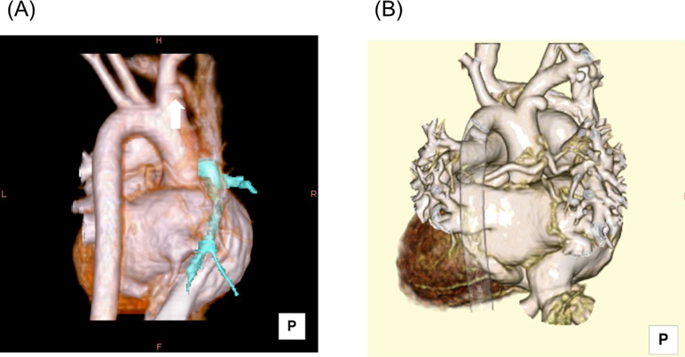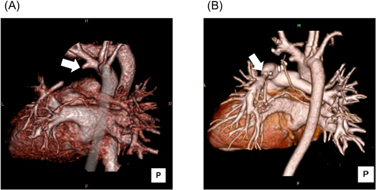 A 19-day-old male (weight 3.0 kg) with respiratory distress was referred to our center because his right PA was not detected on echocardiography. Right IPADO and a closed duct were confirmed by enhanced chest computed tomography (Fig. 4A). A modified BT shunt was constructed on the right side with a 3 mm expanded polytetrafluoroethylene tube as the first palliation. His native right subclavian artery did not seem suitable for directly anastomosing to the right PA as is the case with an original BT shunt procedure.