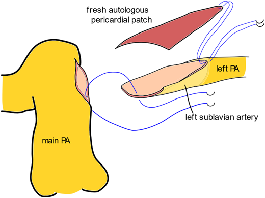 The patient underwent definitive repair at 14 months of age via a median full sternotomy on cardiopulmonary bypass with a beating-heart technique. The left PA seemed too distant from the main PA for a direct anastomosis. To interpose and reconstruct the posterior wall, a flap of the main PA or the left subclavian artery could have been used. We decided to choose the latter, because the previous site of the shunt anastomosis was distal, and use of the tissue as a flap was sensible to make the reconstruction certain. The left subclavian artery was divided at its origin and longitudinally incised. The incision was extended to the distal left PA across the previous anastomotic site, and augmented with a fresh autologous pericardial patch (Fig. 2). Finally, the reconstructed left PA was anastomosed to the left upper aspect of the main PA.