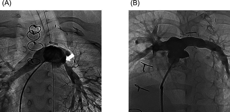 (A) Before the left original Blalock–Taussig shunt: The mediastinal portion of the left PA from the main PA is absent. The ductus arteriosus is diminishing and the arrow indicates a ductal stump at the base of the brachiocephalic artery. The distal left PA is hypoplastic. (B) After the definitive repair (before the balloon angioplasty): The mediastinal portion of the left PA is reconstructed, the arrow indicates the stenotic region. The distal left PA has grown. PA, pulmonary artery.