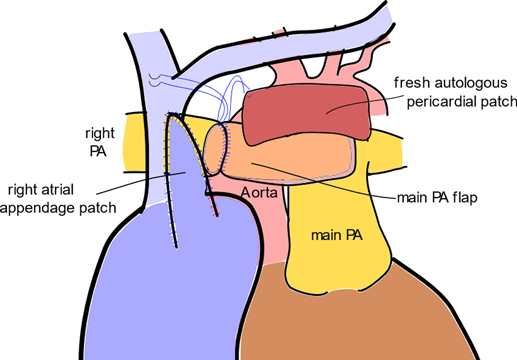 A pedicled flap of the main PA wall was used for reconstruction of the right PA. The flap was anastomosed to the right PA directly, as a posterior wall of the pathway, in front of the aorta in the form of a ‘unilateral’ Lecompte maneuver. The channel was anteriorly augmented with a fresh autologous pericardial patch. The reconstructed right PA compressed the superior vena cava, thus we opened the proximal superior vena cava longitudinally and covered the incision with the right atrial appendage. PA, pulmonary artery.