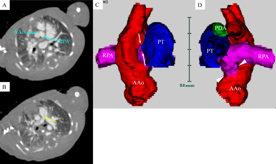 AORPA has two patterns morphologically: the proximal and the distal types.1, 2) The former is characterized by an anomalous RPA that usually arises from the posterior or right lateral aspect of the AAo close to the aortic valve. Its orifice is widely open in the majority. As for the distal type, the morphological feature is the anomalous RPA usually originating from the AAo close to the brachiocephalic artery, or much less frequently from the brachiocephalic artery. Its orifice is likely surrounded by a ductal tissue, and becomes stenotic in many instances.1) AORPA is often associated with patent ductus arteriosus, bridging between the aortic arch and the PT as usual. Occasionally, an aortopulmonary septal defect or interrupted aortic arch coexists.