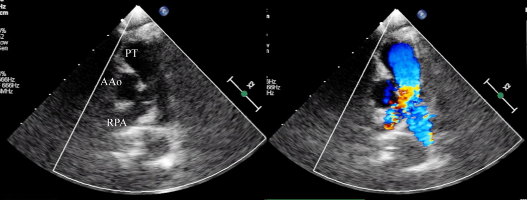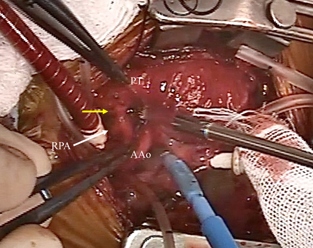 In conclusion, we encountered a premature girl, weighing 1,700 g, who had an unusual form of AORPA. The RPA communicated with the PT via a small lumen. Direct reimplantation to the PT was successfully established. She remained asymptomatic with no RPA stenosis in the longer term at five years postoperatively.