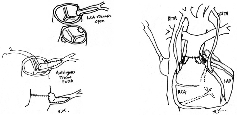 | Patch or Graft | Autologous tissue patch (vein or pulmonary artery) ITA preserved for possible later use | Use of ITA graft Many other arterial grafts can be used at grown-up age |