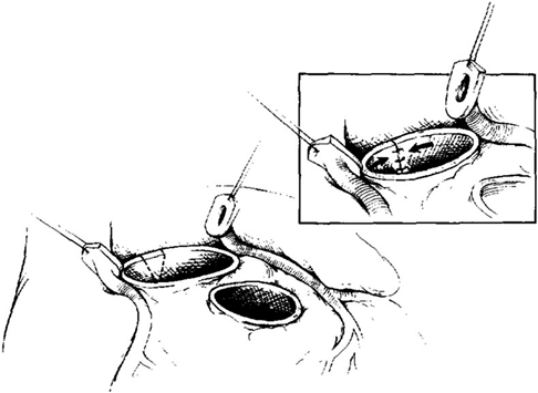 A standard cardiopulmonary bypass with ascending aortic and bicaval cannulation is performed. Cold blood cardioplegia and topical cooling are used for myocardial protection. When patients need arch reconstruction, deep hypothermic circulatory arrest or regional cerebral perfusion can be utilized. After cardioplegic arrest, the aortic root was open 2 to 3 mm above the sinotubular junction, and the aortic valve should be assessed for possible aortic valve repair before resecting the valve leaflets and aortic wall or harvesting the pulmonary autograft. The pulmonary artery is transected at its bifurcation, and the pulmonary valve annulus size is approximated with calibrated dilators before the excision of the autograft. If the valve is not amenable to repair, the diseased aortic valve is excised, and the coronary ostia were removed with buttons of aortic tissue. The pulmonary autograft is then harvested with a 2- to 3-mm muscle cuff, and care was taken to avoid injury to the underlying left main coronary artery and the septal perforators posteriorly. Aortic anulus tailoring is performed if there was a more than 2 mm larger aortic annulus than pulmonary autograft.9) It was begun by excising a triangular wedge of tissue from the aortic valve annulus at the level of the commissure between the left and noncoronary cusps, extending into the anterior leaflet of the mitral valve (Fig. 1). The V-shaped defect was then reapproximated over a calibrated dilator, which was adjusted to achieve a final diameter of 2 mm less than that of the pulmonary annulus. The edges are reapproximated with interrupted, pledgeted, horizontal mattress polypropylene sutures. The autograft is then sutured to the tailored aortic root with a continuous polypropylene suture beginning below the origin of the left coronary artery. The coronary arteries are then implanted into the facing sinuses of the autograft. The distal autograft anastomosis is performed, and the cross clamp removed. The right ventricular outflow tract is reconstructed with an appropriately sized cryopreserved pulmonary allograft while the patient was being rewarmed.