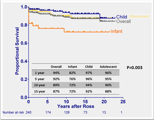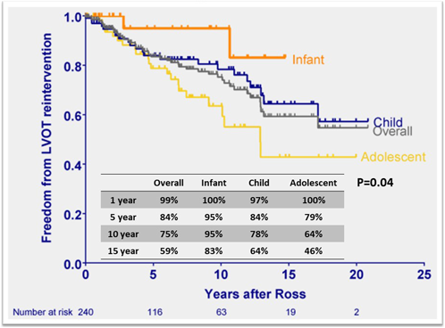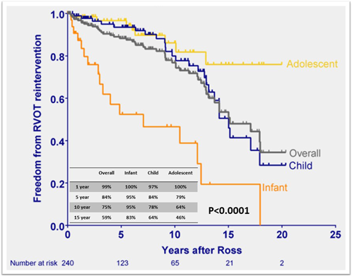 These contemporary data show the increased utilization of the Ross procedure and improved survival outcomes over the decades. Outcomes after the Ross procedure in children vary by age at the operation. The Ross procedure in the neonate/infant population remains challenging, with higher early mortality due to the complex left heart disease and the severity of the disease. However, this is balanced by the better long-term durability of the neoaortic valve in infants, but in the context of a higher reintervention rate on the RVOT in this younger age population. Further study, perioperative management strategy, or surgical innovation will lead to improve the outcomes of the Ross procedure in the youngest children. For older children and adults, the Ross procedure performs well, albeit with a higher rate of autograft reintervention than neonates and infants, which will hopefully be mitigated by wrapping techniques when the diameter of the autograft allows.
