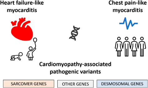 In summary, these results highlight clear clinical and genetic differences in children and adolescents with cardiomyopathy-associated genetic variants and myocarditis (Fig. 3). Overall, infants or young children with heart failure-like myocarditis are more likely to have alterations in sarcomere genes, whereas adolescents with chest pain-like myocarditis and preserved cardiac function are more likely to have genetic variants in desmosomal genes (Fig. 4).