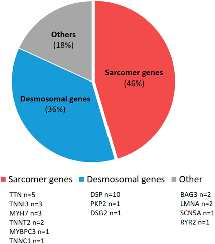 With regard to desmosomal genes in acute myocarditis and preserved myocardial function of the chest pain-like type myocarditis, it is shown that the incidence of death, heart failure, ventricular tachycardia and myocarditis recurrence is significantly increased in patients with detected variants in desmosomal genes compared to patients without variant detection and to patients without genetic testing at all.24)