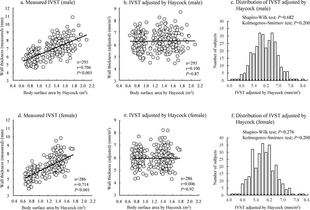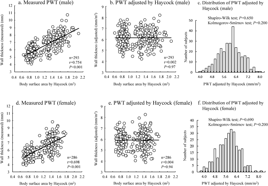 The relationship between LVWT and BSA before and after adjustment by BSAα as well as distributions of the adjusted values for IVST and PWT were shown in Fig. 1 (IVST) and Fig. 2 (PWT). In these figures, BSA by Haycock’s formula was used. The figures showed that LVWT adjusted by division of BSAα had no significant correlation with BSA (Figs. 1 and 2, the middle panels) and that the adjusted values for LVWT were normally distributed (Figs. 1 and 2, the right panels). The relationships and distribution by BSA of DuBois’ and Fujimoto’s formulae were shown in Supplementary Figs. 1 to 4. Although there were minor differences in the scatter plots and distributions among the three BSA methods, the results were similar.