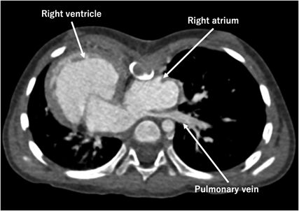 In our case, simultaneous repair was considered necessary to secure the Fontan pathway by correcting the pectus excavatum; compression to the Fontan route and the pulmonary veins were avoided. As anticipated preoperatively, postoperative CT revealed that the Fontan conduit occupied a considerable space within the thoracic cavity. The pulmonary veins appear better structured than preoperative state.