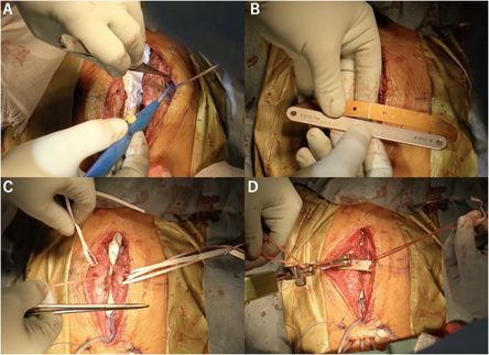 A: A pocket for a pectus bar was created in front of the sternum and the costal cartilage. B: A soft template bar was pre-shaped to guide the bending of the 5-inch pectus bar. C: Two cables were passed around the costal cartilage on both sides of the sternum. D: The cables were tightened and pulled up to correct the sternum and the costal cartilage, conforming to the pre-shaped 5-inch pectus bar.