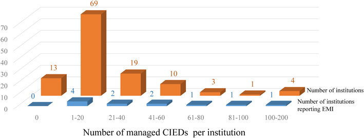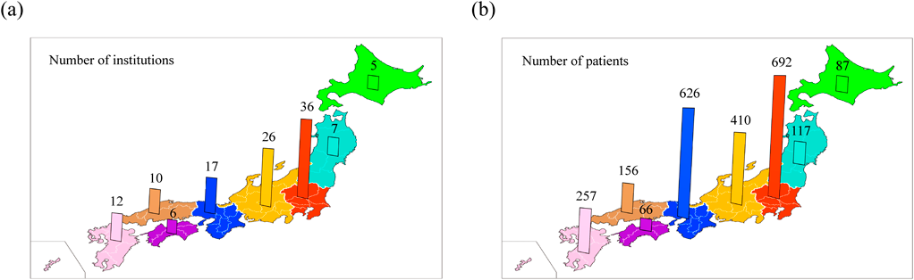The responses to the questionnaire above were analyzed based on the following aspects: 1) the number of institutions managing abdominal CIEDs, distribution of types of the facilities (university hospital, general hospital, or children’s hospital), and the number of managed patients in each region of Japan (Hokkaido, Tohoku, Kanto, Chubu, Kinki, Chugoku, Shikoku, and Kyushu); 2) distribution of the number of patients managed at each institution; 3) the number of institutions reporting magnet response due to EMI and the number of patients who experienced the event; 4) the detail of magnet response due to EMI by a tablet (location, cause, and other circumstances).
