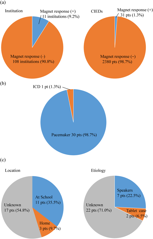 The magnet response due to EMI cause by a tablet was reported in 11 institutions (9.2%) counting 31 patients (1.3%) (Fig. 3a). In terms of the types of CIEDs, magnet response was activated in a pacemaker in 30 patients (98.7%) and an ICD in one patient (1.3%) (Fig. 3b).