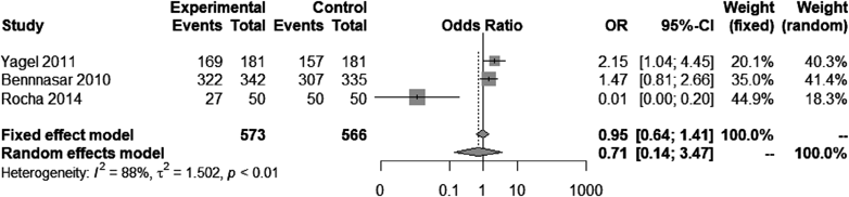 Three studies were scrutinized in which the detection rate on 3D/4D modality was compared to that with 2D images only. One study3) included healthy participants, another2) included patients with heart diseases, and the third1) included both. In these three studies, TUI was used for 3D/4D images. During the meta-analysis, the heterogeneity of the test results was considered, and the overall evidence was described using random effects. The CI of the OR for the detection rate of heart structures overlies 1.0. There was no significant difference between the detection rate on 3D/4D images and that on 2D images only (OR, 0.71; 95% CI, 0.14–3.47; p=0.66).